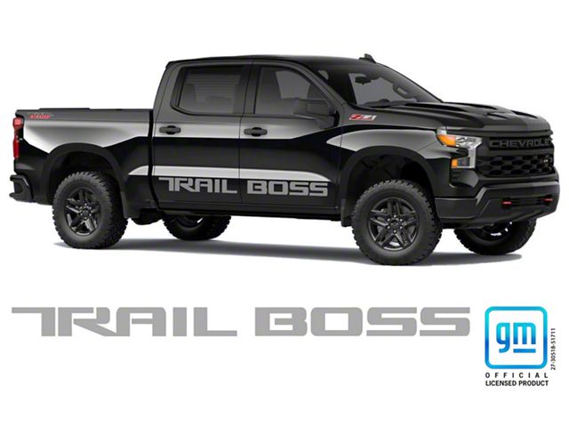 Application. The Emblems Plus Trail Boss Body Side Decals; Silver fit 2019–2026 Silverado 1500 Trail Boss crew cab side panels.