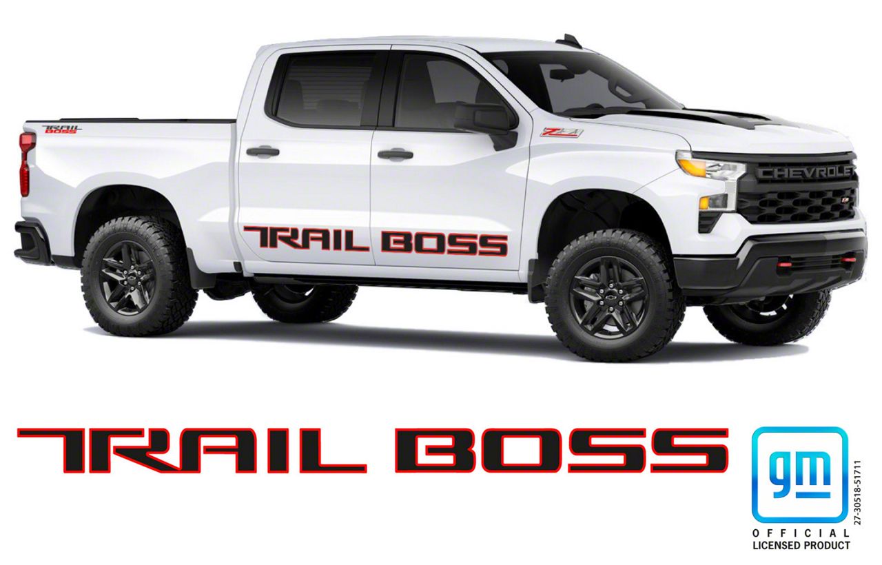 Application. These Emblems Plus TRAIL BOSS Z71 Body Side Decals; Redline/Black fit 2019–2026 Chevrolet Silverado 1500 Trail Boss Crew Cab models.
