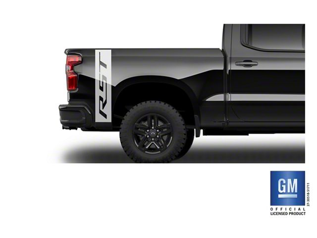 Custom RST Styling in a Clean Vertical Layout. These RST Vertical Rear Bedside Decals give your Silverado a bold yet factory-styled appearance. Finished in a gloss silver tone, they bring subtle contrast and upscale character to the rear quarter panels without overwhelming the body lines.