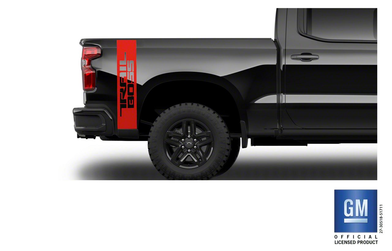 Elevating Vehicle Aesthetics. Incorporating these bold red TRAIL BOSS vertical decals will noticeably improve the overall appearance of your Silverado 3500 HD. The Emblems Plus TRAIL BOSS Vertical Rear Bedside Decals provide a distinct, customized aesthetic that will differentiate your vehicle and emphasize its robust TRAIL BOSS character.