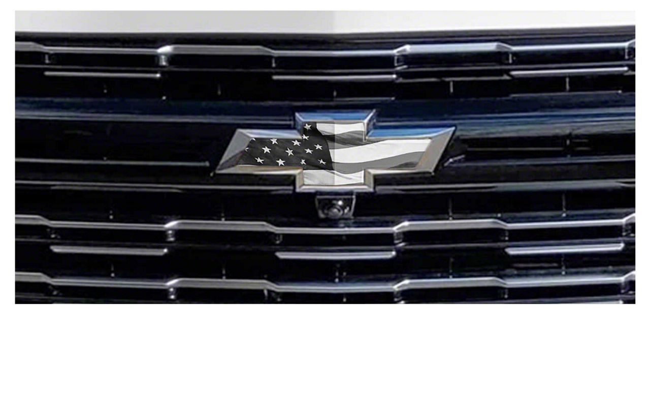 Custom Overlay Decals. The Chevrolet Bowtie Grille/Liftgate Overlay Decals with a black and white American flag design offer a unique and patriotic way to customize your vehicle. These decals enhance the grille and liftgate emblems with a detailed black and white American flag pattern, adding a stylish and distinctive look to your Chevrolet Tahoe.