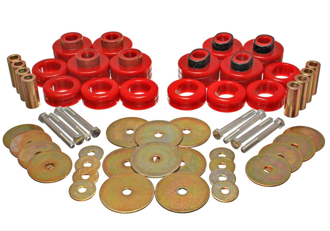 Durable Support. The Body Mount Bushings and Hardware Kit is an essential upgrade for your Dodge RAM 2500, designed to replace distorted and worn-out OE rubber mounts. By combining the best qualities of rubber and aluminum body mounts, it ensures a smooth ride while being able to withstand the most demanding road or track conditions. The inclusion of long-lasting and durable red polyurethane bushings further enhances its value.