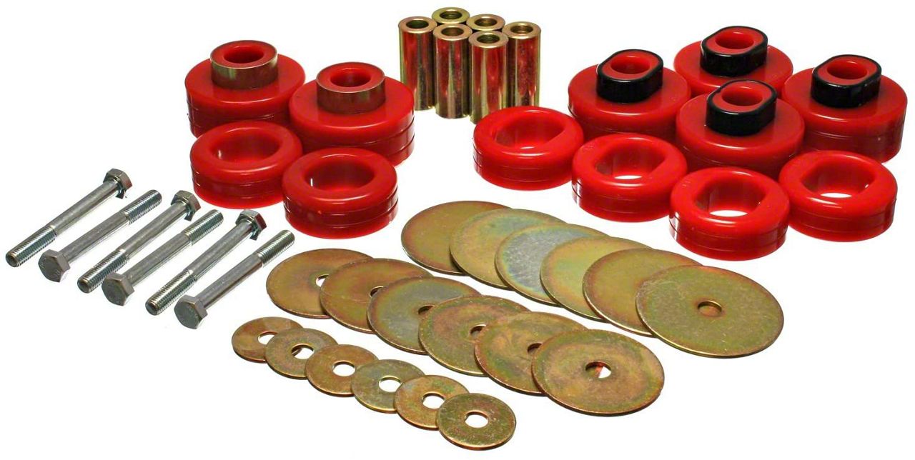 Installation. The Body Mount Bushings and Hardware Kit; Red involves lifting the body slightly off the frame to replace the old bushings with new ones. This can be labor-intensive and may require special tools like a jack and stands to safely lift and support the body.