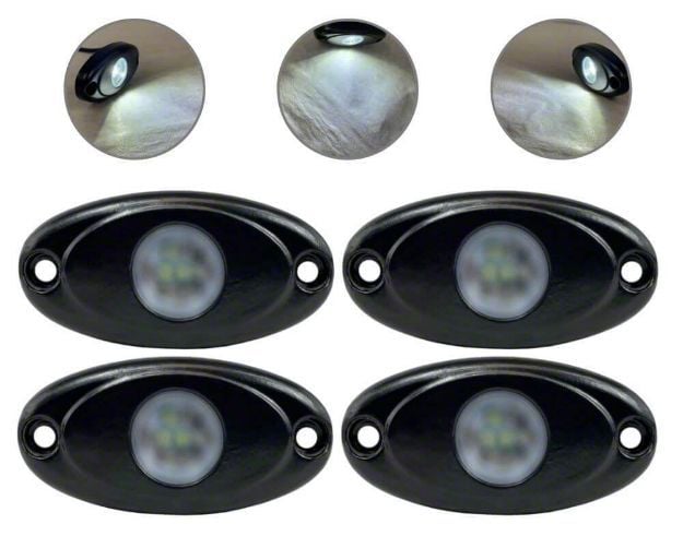 Brilliant Illumination Technology. The Extreme LED Rock Light Kit enhances vehicle undercarriage or wheel well lighting with its powerful pure white output. Each pod in this kit contains 3 LEDs, totaling 15 watts per light, housed in a matte black finish with clear transparent lenses for optimal light dispersion. This kit comes in sets of four pieces, designed to provide comprehensive coverage and intense illumination, suitable for off-road adventures or customizing your vehicle's aesthetic.