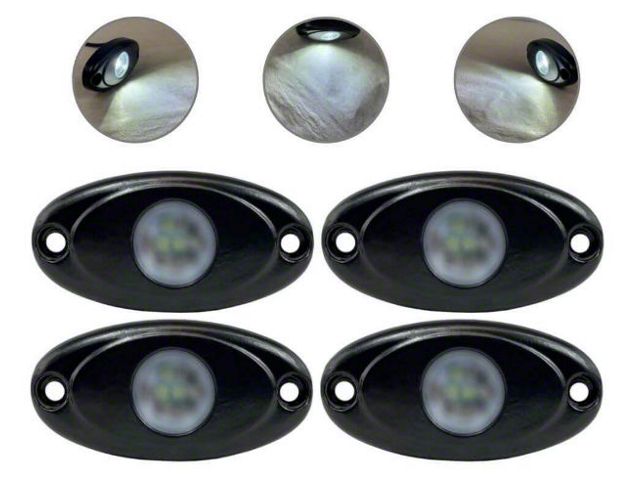 Brilliant Illumination Technology. The Extreme LED Rock Light Kit enhances vehicle undercarriage or wheel well lighting with its powerful pure white output. Each pod in this kit contains 3 LEDs, totaling 15 watts per light, housed in a matte black finish with clear transparent lenses for optimal light dispersion. This kit comes in sets of four pieces, designed to provide comprehensive coverage and intense illumination, suitable for off-road adventures or customizing your vehicle's aesthetic.