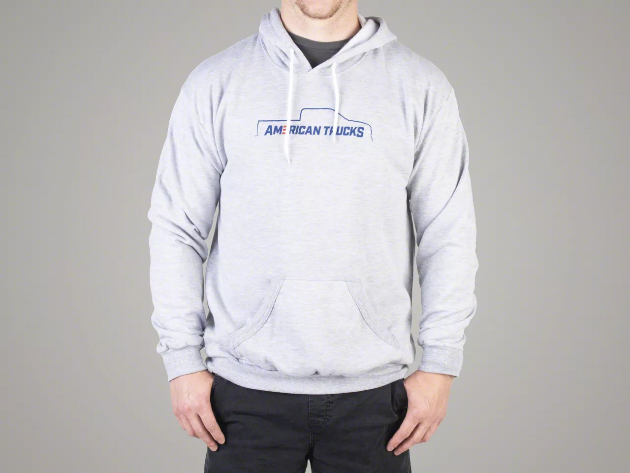 AT Silhouette Hoodie. Keep warm and comfortable even on the coldest days with this great looking Hoodie from AT. This heather gray pull over Hoodie features the silhouette of a pick-up across the front of the chest with the AmericanTrucks Logo located inside. This drawstring Hoodie with front pouch pocket is the perfect piece of outerwear for cool morning drives, car shows or fall trail runs.