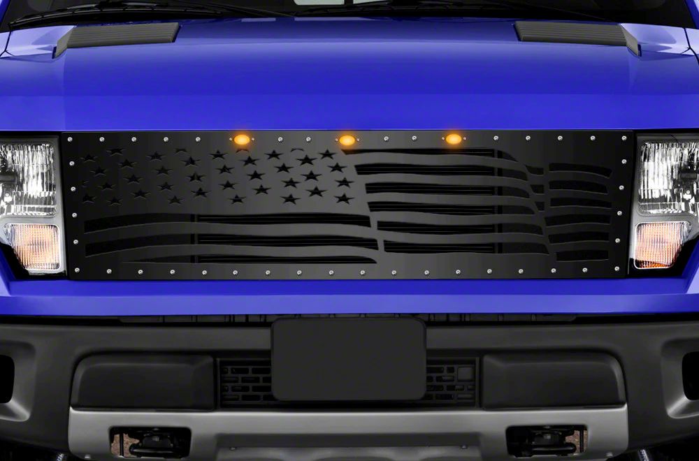 Distinctive Custom Grille. The 1-piece steel upper replacement grille, America Wave, offers a unique upgrade that enhances your vehicle’s front-end appearance. It provides a bold, patriotic look while protecting the radiator and engine bay from debris. This grille is designed to replace the factory part seamlessly without compromising functionality.