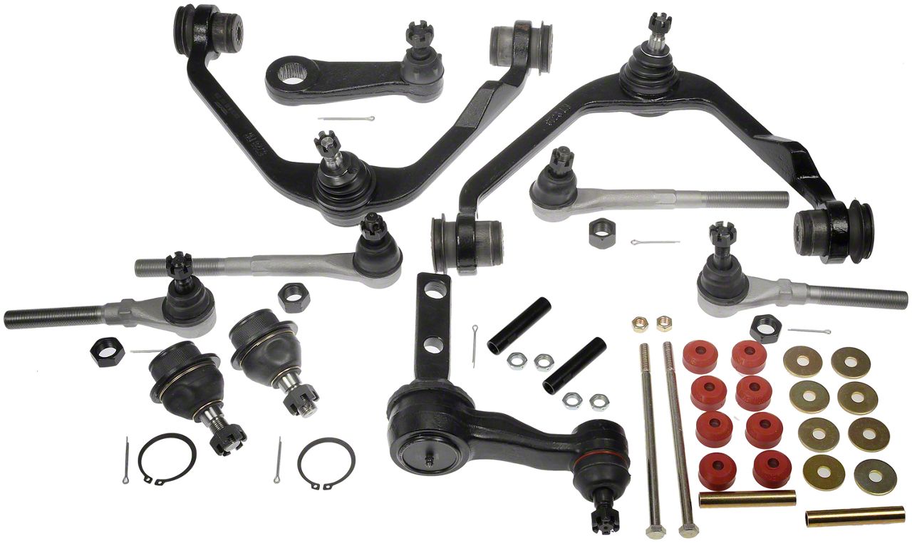 • Package Contents: 4 Outer Tie Rod Ends, 2 Upper Control Arms, 2 Stabilizer Bar Link Kits, 2 Ball Joints Assemblies, 2 Tie Rod Adjusting Sleeves, 1 Steering Idler Arm, 1 Steering Pitman Arm