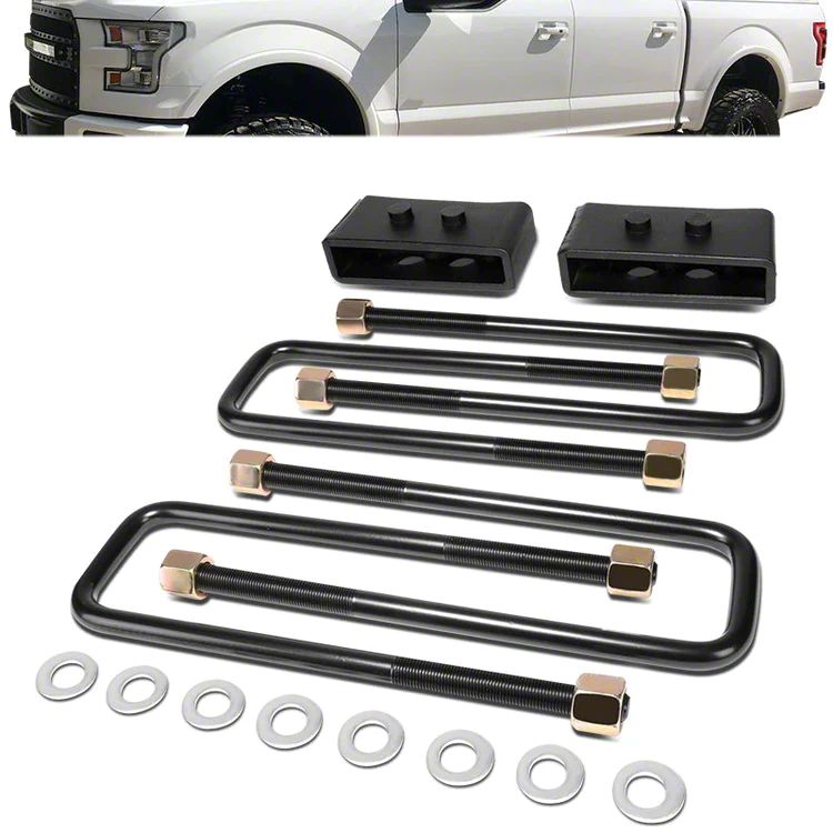 Better Off-Road Capability. This 1.50-Inch Rear Lift Block Kit provides a subtle yet impactful lift to the rear of your vehicle, improving its overall stance and aesthetics. The increased ride height allows for better clearance over uneven surfaces and creates additional space in the truck bed for hauling larger cargo. This lift kit offers a perfect balance of functionality and style, making your F-150 more versatile and visually appealing.