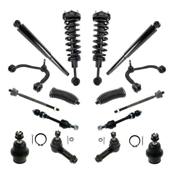 Comprehensive Components. Restore and improve the road-handling capacity of your F-150 with the 16-Piece Steering and Suspension Kit. This comprehensive kit is designed to provide all the essential components needed to enhance your vehicle's steering and suspension system.