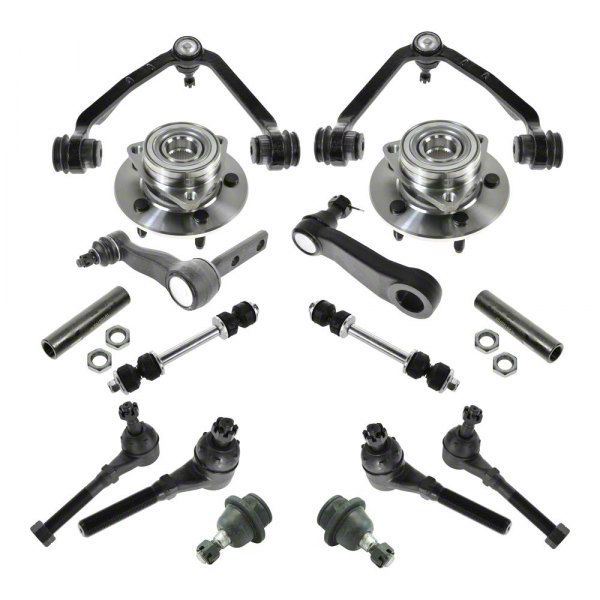 Complete Front Kit. The 16-piece Steering, Suspension, and Drivetrain Kit provides a comprehensive solution for restoring front-end performance on affected trucks. It includes all critical components such as ball joints, tie rods, control arms, hubs, and the idler arm—all essential for maintaining proper alignment, steering precision, and drivetrain stability. This kit is ideal for addressing wear and tear in heavy-duty trucks, ensuring improved handling and safety.