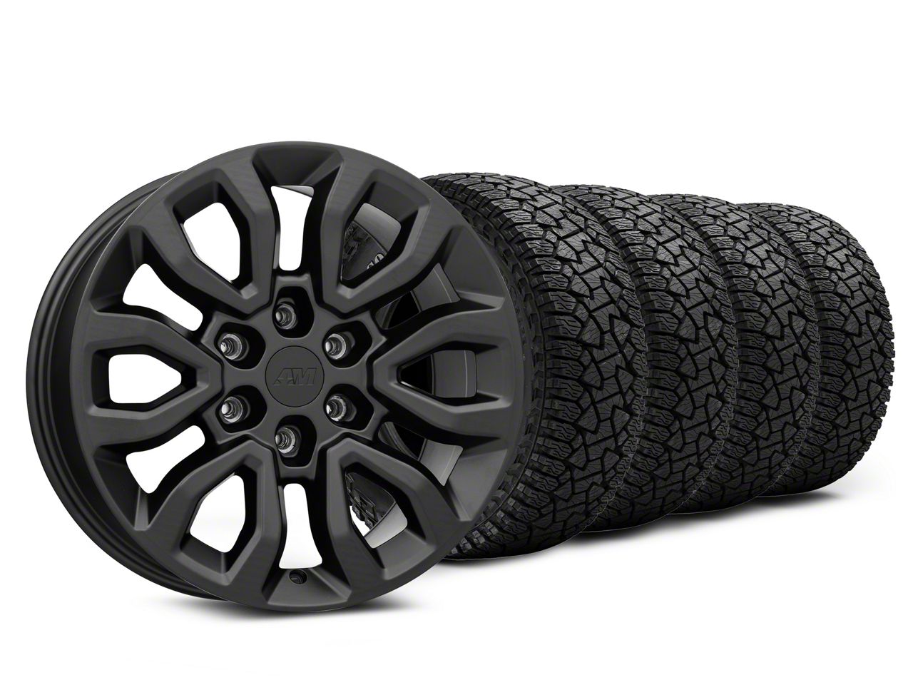 Mounted and Balanced Wheel and Tire Kit. This wheel and tire combo kit features (4) 18x9 Gen2 Raptor Style Matte Black 6-Lug Wheels and (4) Gladiator All-Terrain X-Comp A/T 35" - 35x12.50R18 tires that have been put together into an easy to buy kit that arrives to your door already mounted and balanced ready to be installed on your vehicle.