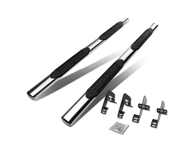 Construction and Appearance. Crafted from high-quality stainless steel, these side step bars are built for strength and longevity. The polished chrome finish adds a sleek, refined look, while the matte black step pads provide a secure footing. Their straight design enhances the truck’s appearance while maintaining a rugged and practical structure.