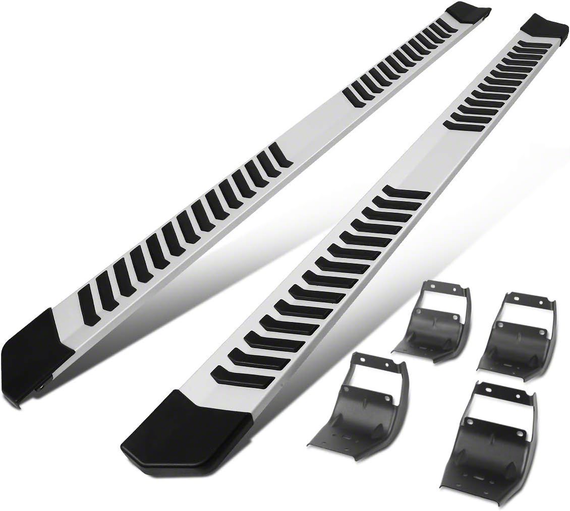 Construction and Appearance. Crafted from durable stainless steel with ABS plastic end caps, these running boards are built for strength and longevity. The polished silver finish adds a touch of sophistication, while the anti-slip inserts ensure safe footing in all weather conditions. Additionally, the sturdy design helps protect your truck from bumps, hits, and other road damage.