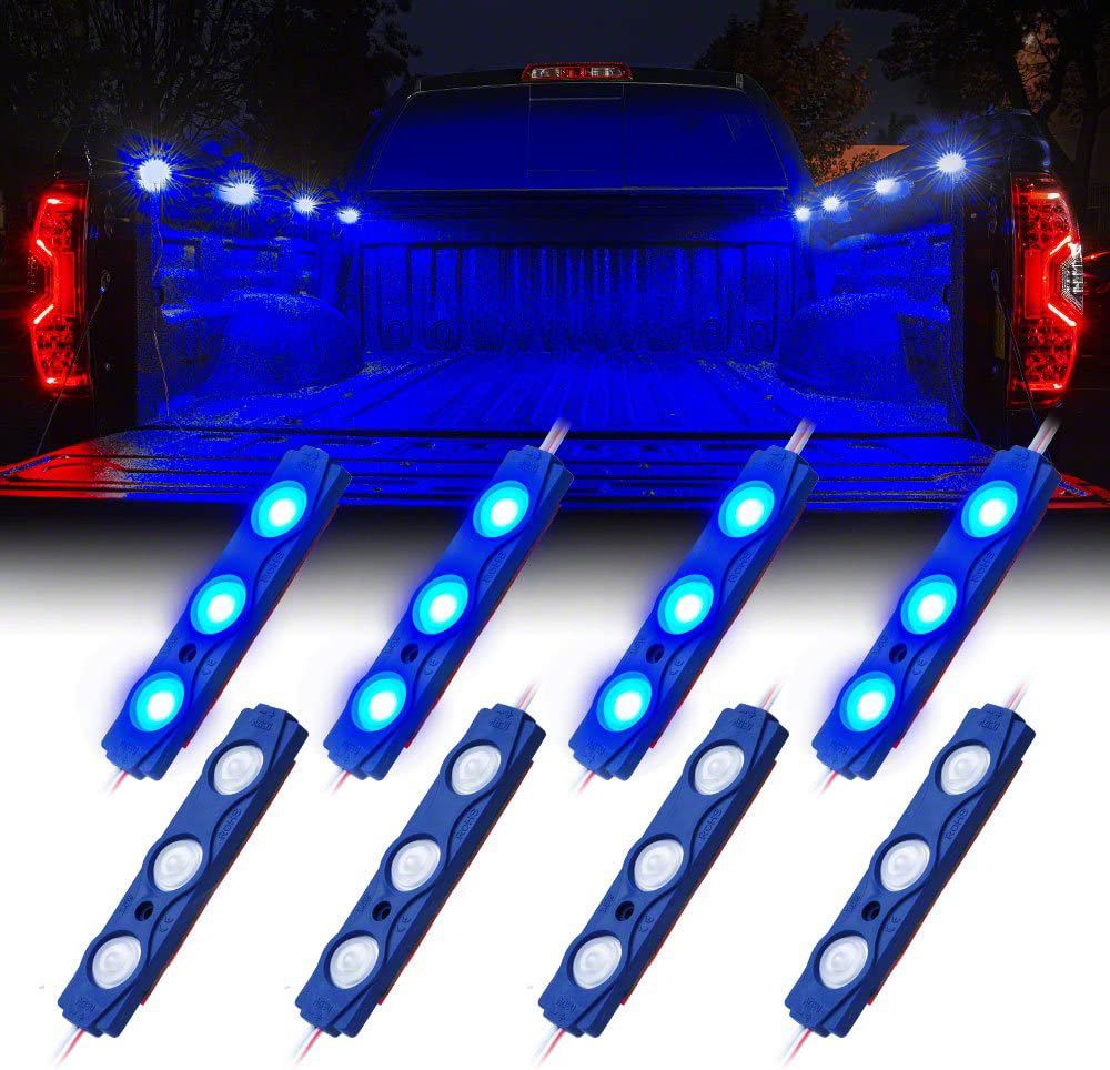 Application. This Blue 8-Led Rock Light Pod Truck Bed Lighting Kit is designed to universally fit Ford F-150 models.