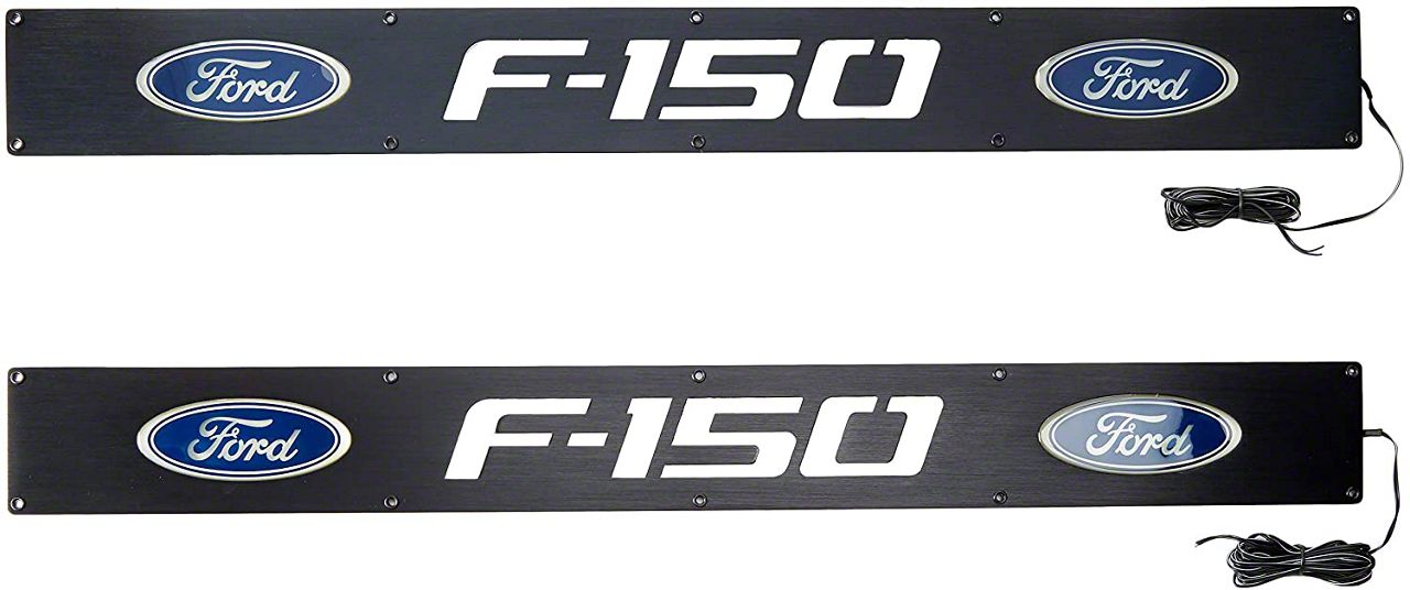 Lighted Door Sills. These Billet Front Door Sill Plates with Ford F-150 Logo in a Black Finish with Blue Illumination make it easier to see the step into your F-150's cab with the brilliant blue lighting. Aside from making the cab look good, these also provide protection for the door frame against the wear and tear of daily use.