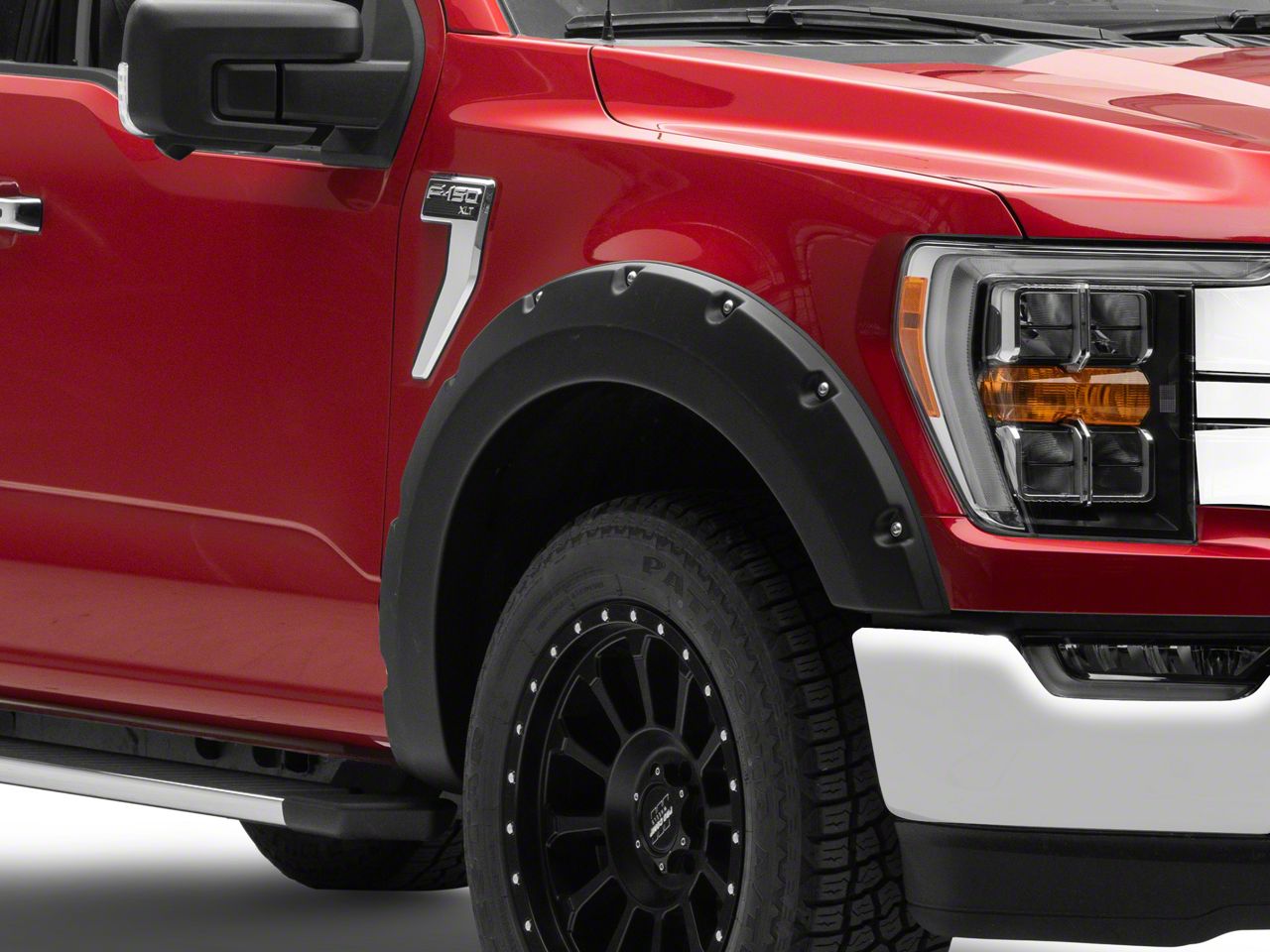 Stylish and Functional. Give your F-150 a rugged upgrade with the Bolt-On Style Fender Flares in Textured Black. This set of 4 front and rear fender flares have a bolt-on style design that gives your truck an off-road-ready vibe while protecting the opening of the wheel wells from road debris. These fenders come with stainless steel bolts for a more authentic overall look.
