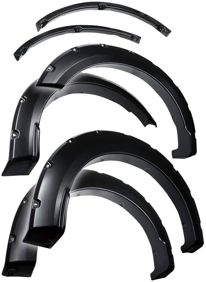 Bolt-Riveted Style. Constructed from high-quality, durable ABS plastic, these fender flares are built to last and withstand the elements. Each piece is UV treated, ensuring that the smooth matte black finish remains free from chalking and fading over time. The bolt-riveted style adds a rugged, aggressive look to your F-150, enhancing its appearance while providing practical benefits.