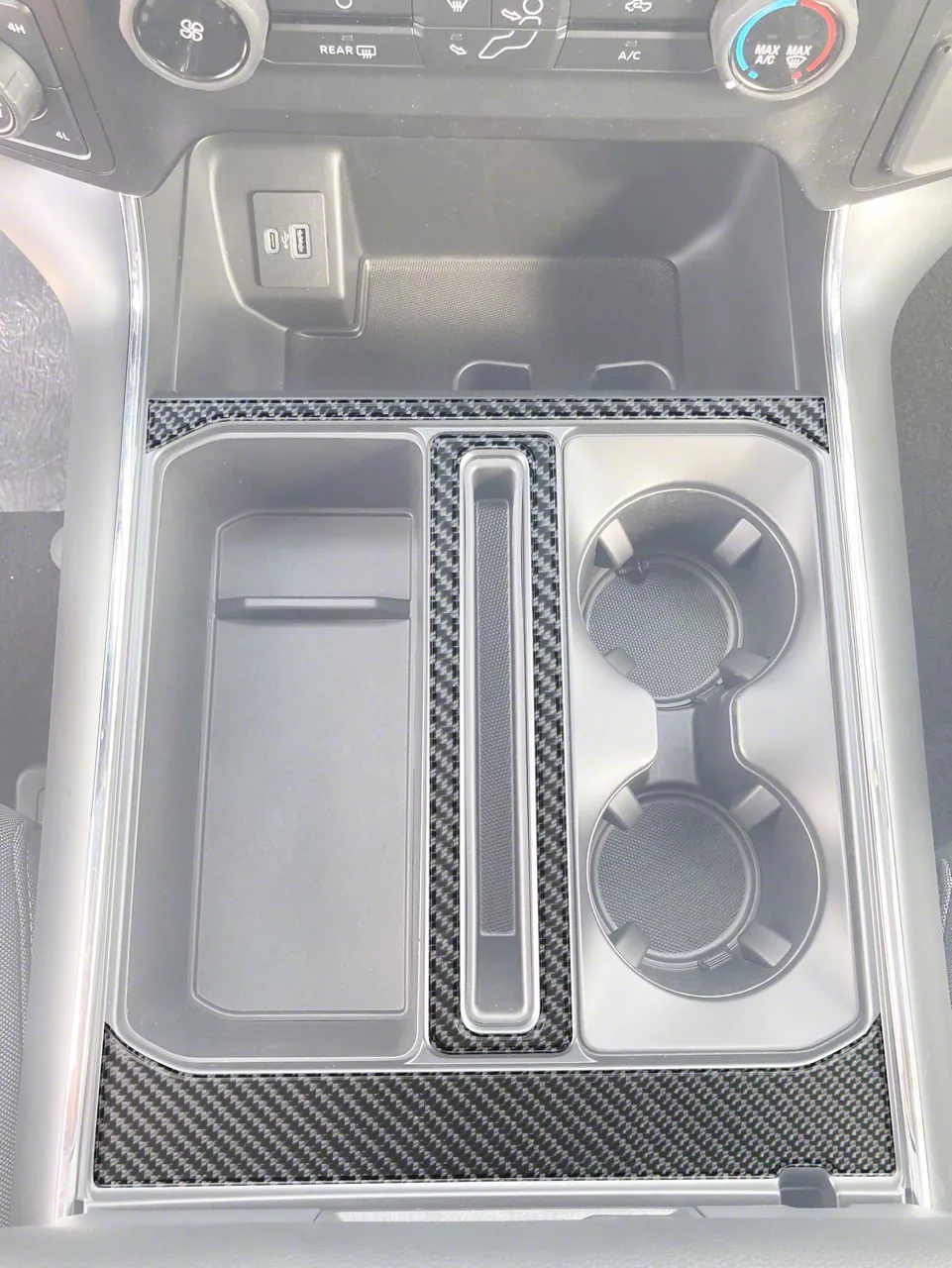 Enhance Your Interior Style. The Center Console Accent Trim adds a touch of sophistication and elegance to your vehicle's interior. With a glossy black forged carbon fiber finish, this trim set instantly upgrades the look of your center console, providing a stylish and modern appearance.