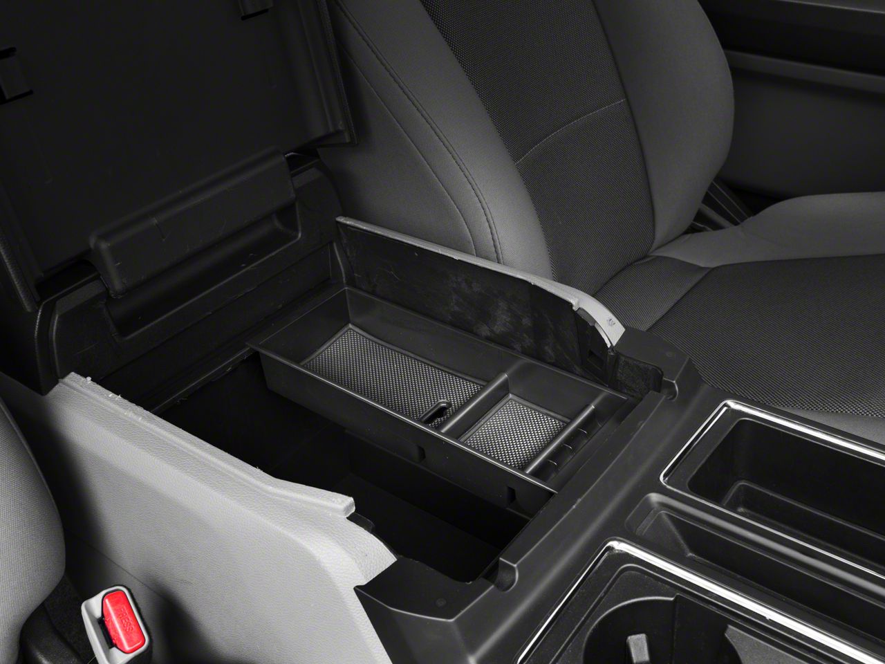 Maximize Your Center Console. Maximize your F-150’s center console storage capabilities with this efficient Center Console Organizer. This tray-style organizer features two compartments of varying lengths as well as a molded coin organizer. This layout offers a wide range of storage possibilities, especially when used with the factory-style console organizer. What’s more, this organizer frees up the rest of your center console for storing larger items. Finally, this component features two silicone mats, one for each compartment, and an access port allowing you to conveniently run your charging cable.