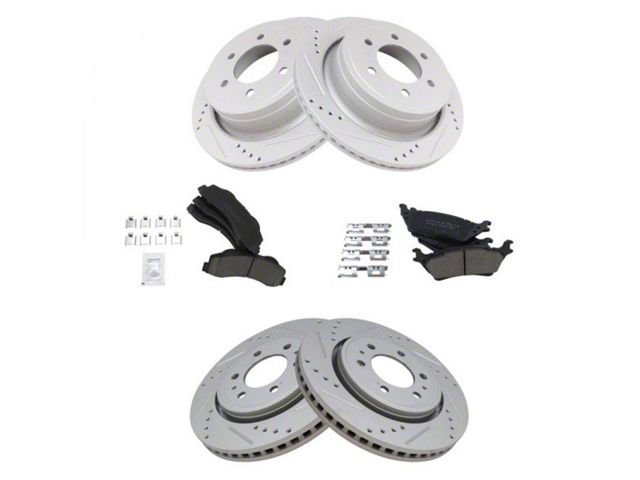 Superb Stopping Power. Drive confidently and brake at a split-second notice with the Ceramic Performance 6-Lug Brake Rotor and Pad Kit (Front and Rear). This 6-lug rotor and brake pad upgrade are designed for front and rear placement. The rotors are cross-drilled, slotted, and vented for improved braking performance, while the brake pads are positive-molded for less dust and have and multi-layer shim for less noise and vibration.