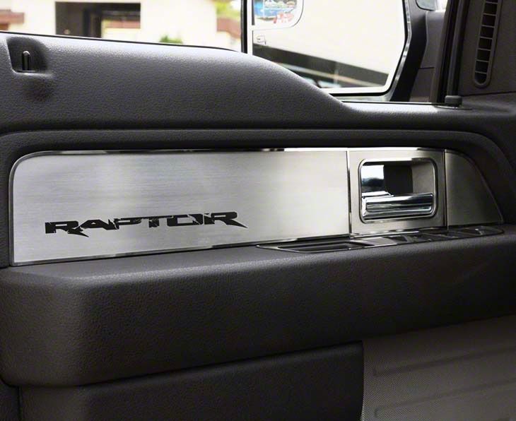 Construction and Appearance. Crafted entirely from premium stainless steel, these inserts feature a brushed finish that is both visually striking and durable. The front door panels include polished trim with a precision laser etched "Raptor" logo, while the rear panels maintain the brushed steel look with polished edging to ensure a cohesive and high-quality appearance throughout.