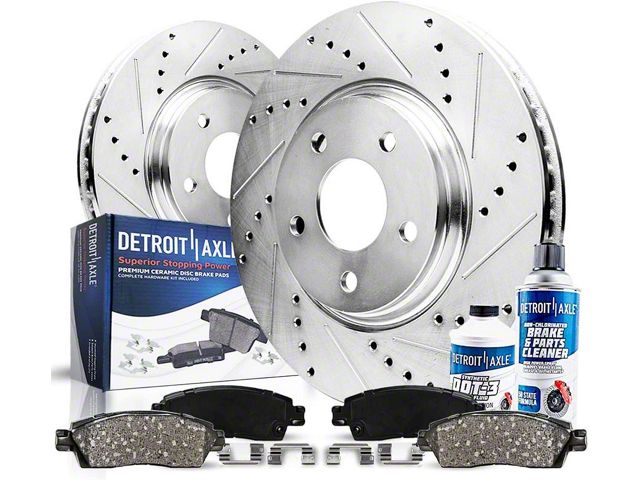 All-In-One Brake Upgrade Kit. The Drilled and Slotted 5-Lug Brake Rotor, Pad, Brake Fluid and Cleaner Kit provides a comprehensive solution for improving brake performance on your F-150. Designed for 4WD models, the kit includes high-performance rotors and pads that reduce noise and dust while enhancing stopping power and heat dissipation. It's ideal for drivers who demand more from their braking system under heavy use or towing conditions.