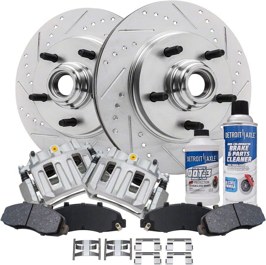 Complete Front Brake Upgrade Kit. The Drilled and Slotted 5-Lug Brake Rotor, Pad, Caliper, Brake Fluid and Cleaner Kit (Front) is designed to enhance the braking performance of 2000-2003 2WD Ford F-150 models with rear disc brakes, excluding the Lightning edition. This comprehensive kit includes front drilled and slotted brake rotors, ceramic brake pads, disc brake calipers, brake fluid, and cleaner, providing a complete solution for improved stopping power and reduced brake fade. The kit is engineered to exceed OEM specifications, ensuring superior performance and durability.