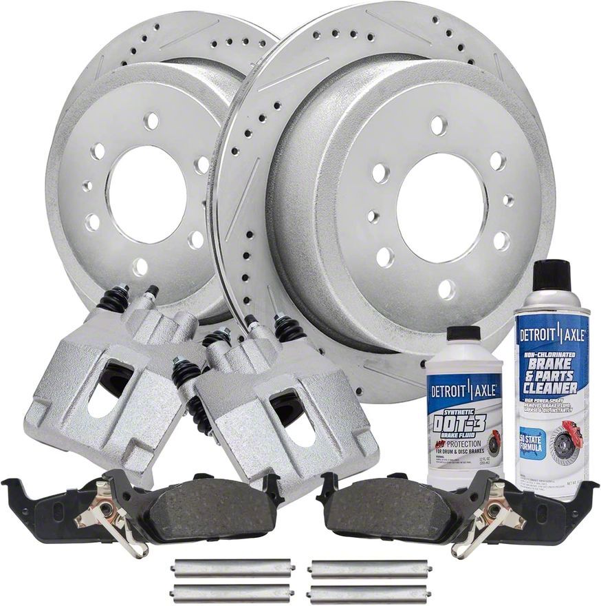 Complete Rear Brake Restoration Kit. The Drilled and Slotted 6-Lug Brake Rotor, Pad, Brake Fluid and Cleaner Kit is a high-performance replacement solution for restoring braking efficiency on your vehicle. Designed for Rear applications, this kit includes all essential components to upgrade your stopping power and maintain safe braking conditions. Ideal for daily driving or light-duty towing, it's a reliable solution for worn-out factory brake systems.