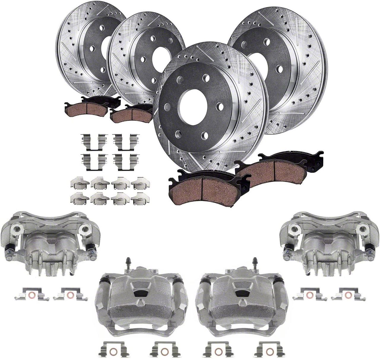 Complete Brake Upgrade Kit. This Brake Rotor, Pad, and Caliper Kit offers a comprehensive solution to upgrading the braking system of your Ford F-150. With polished zinc finish drilled and slotted rotors, matte black ceramic compound pads, and raw metal stainless steel calipers, this kit provides superior stopping power for both the front and rear of your truck.