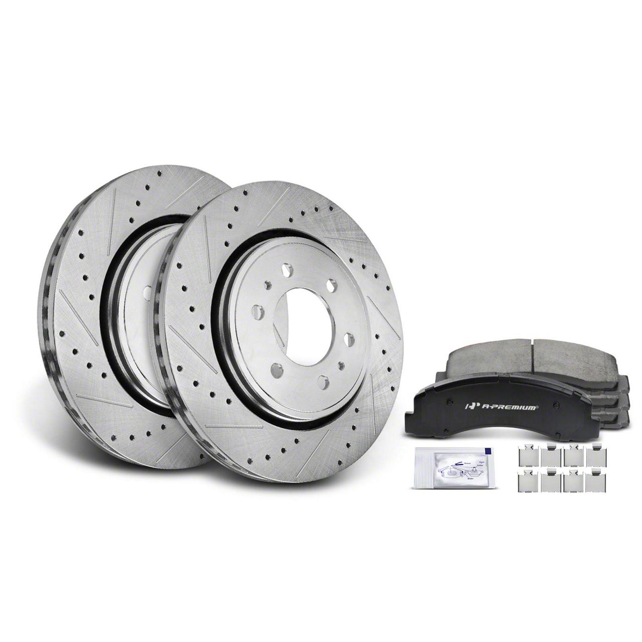 Complete Brake Solution. The Drilled and Slotted 6-Lug Brake Rotor and Pad Kit; Front provides a comprehensive front brake replacement option for vehicles requiring high-quality braking components. This kit includes all necessary hardware and features slotted rotors designed for improved heat dissipation and braking efficiency. It ensures optimal stopping power and brake system reliability on trucks and SUVs.