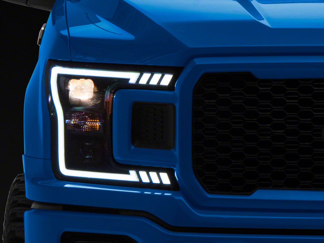 Application. These DRL LED Light Bar Projector Headlights; Black Housing; Smoked Lenses are engineered to fit 2018-2020 Ford F-150 models with Factory Halogen Headlights.