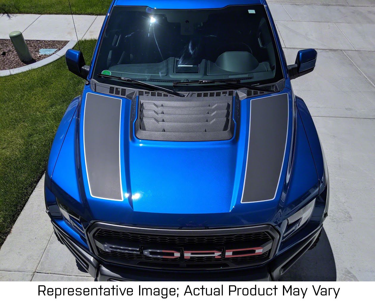 High-Quality Racer Aesthetics. Introducing the Dual Hood Decals with Pin Stripes. These stylish decals are a perfect way to enhance the look of your vehicle and add a touch of personalized flair. The decals feature a dual pin stripe print, creating a sleek and sporty appearance for your F-150's hood. They are made from high-quality, vinyl-based paint to ensure long-lasting durability and resistance to fading, even in harsh weather conditions.