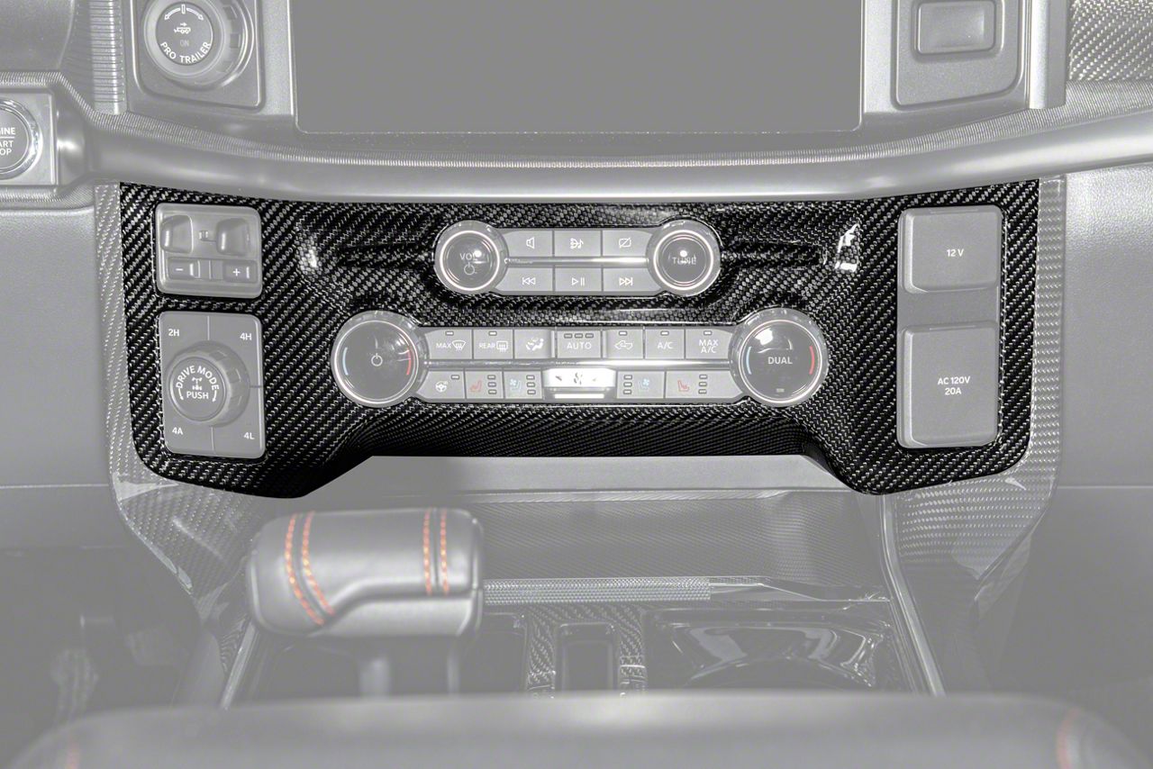 Premium Interior Upgrade. The Factory Style Center A/C and Radio Control Panel Trim Cover adds a sleek and modern touch to your F-150's interior. Designed to mimic the factory style while elevating the cabin, this trim cover enhances appearance with the strength and appeal of carbon fiber. It provides a durable, long-lasting upgrade that instantly refreshes the dashboard look.