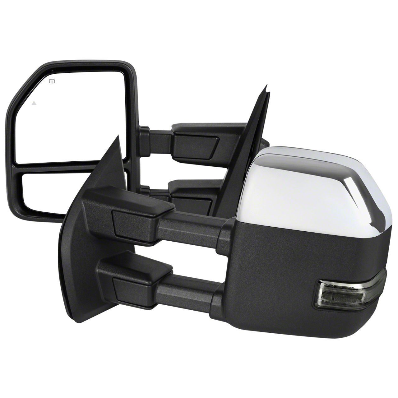 Construction and Appearance. Featuring a polished chrome finish, these mirrors add a sleek and durable accent to your vehicle. Built with integrated lighting and a rugged housing, they combine functionality with a refined appearance while withstanding the demands of towing and daily use.