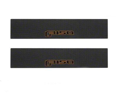 Front Door Sill Protection with F-150 Logo; Raw Carbon Fiber; Black and Orange (15-20 F-150)Find parts that fit my vehicle