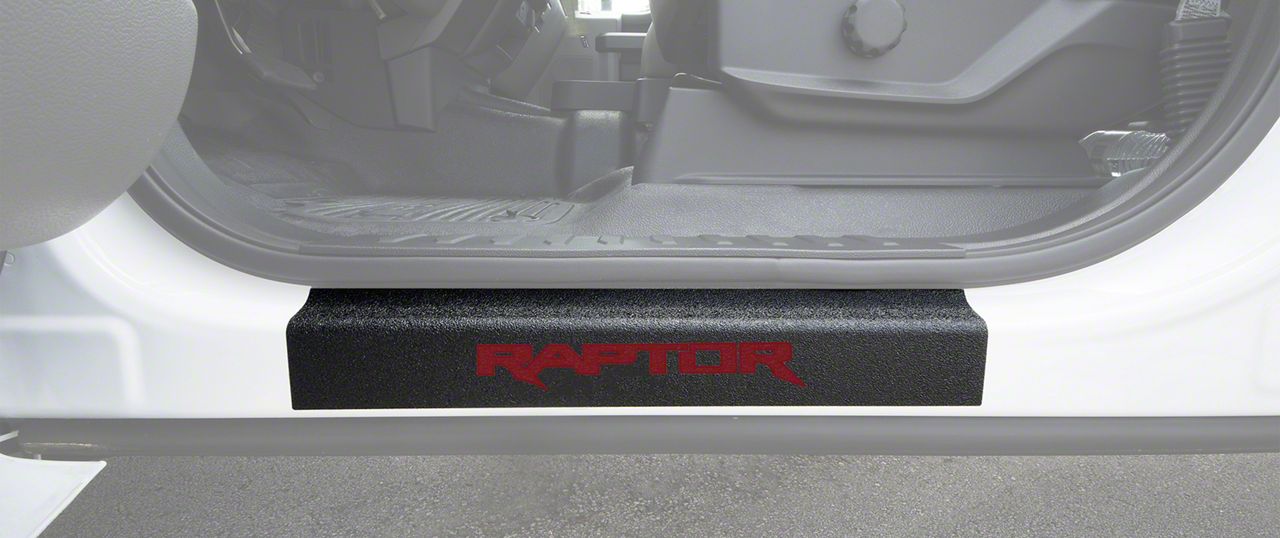 Door Sill Protectors. Add a more expensive, upscale appearance to your Raptor's interior with a set of Front Door Sill Protectors that promote the Raptor logo. These Tuf-Liner Series Door Sill Protectors feature a similar look to spray in bed-liner and will protect your F-150's sills from scratches, dirt, rocks, and chipping paints. These Door Sill Protectors are an affordable and simple way to personalize your Ford F-150 Raptor.