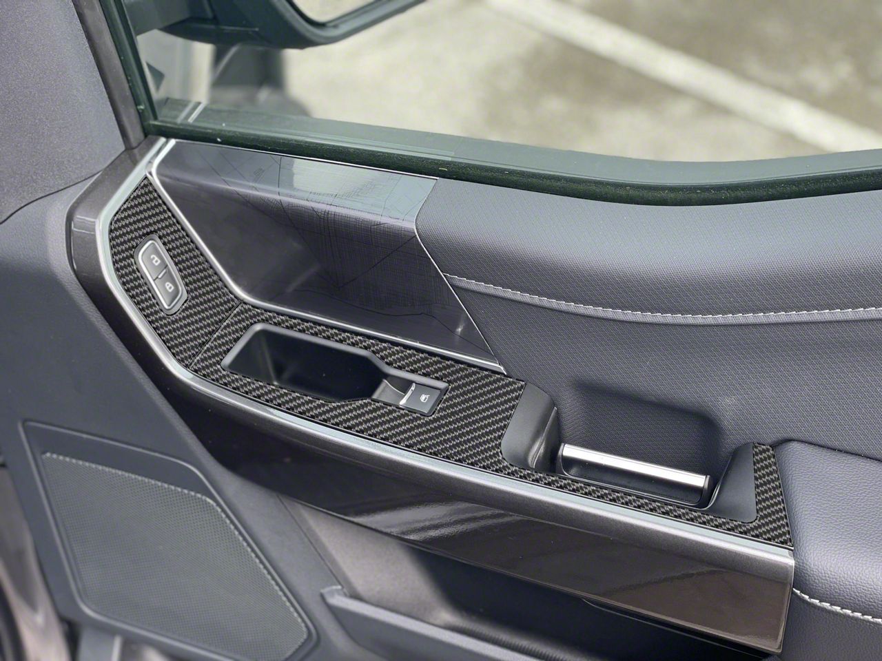 Application. This Front Door Switch Accent Trim Kit; Dome Carbon Fiber is designed to fit 2021-2026 Ford F-150 models without memory seats.
