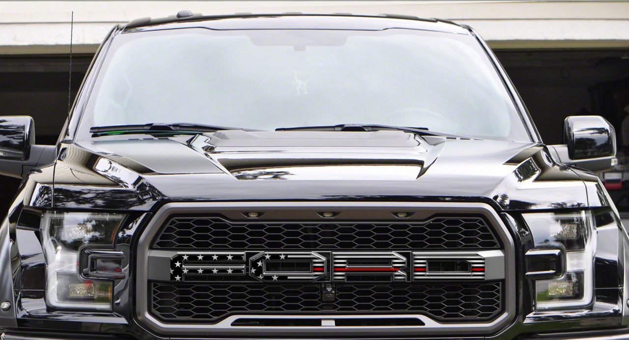 Show Your Patriotism and Support. Add a striking and meaningful upgrade to your 2017-2020 F-150 Raptor with these Black and Silver American Flag grille letter overlays featuring a Thin Red Line. This patriotic design not only enhances the vehicle's front appearance but also symbolizes support for firefighters, combining style with a statement of respect and gratitude.