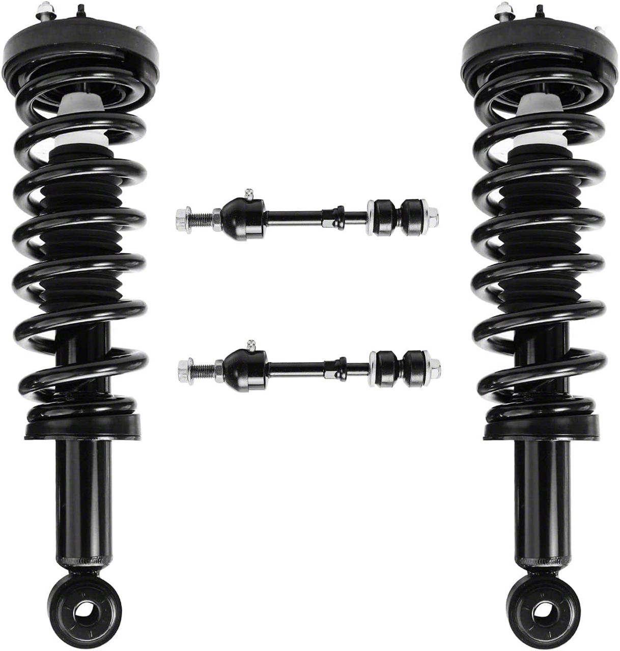 Description. Kit Includes: (2) Front Struts w/Coil Spring Assembly + (2) Front Sway Bar End Links