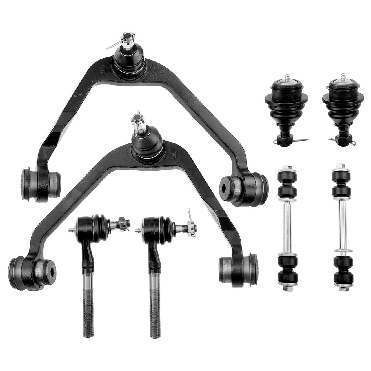 COMPREHENSIVE SUSPENSION KIT. The Front Upper Control Arm Assemblies, Ball Joints, Sway Bar Links, and Outer Tie Rod Ends Kit provides essential components to restore and enhance front suspension performance. It is designed for replacing worn or damaged parts, thereby improving vehicle handling, safety, and ride comfort.