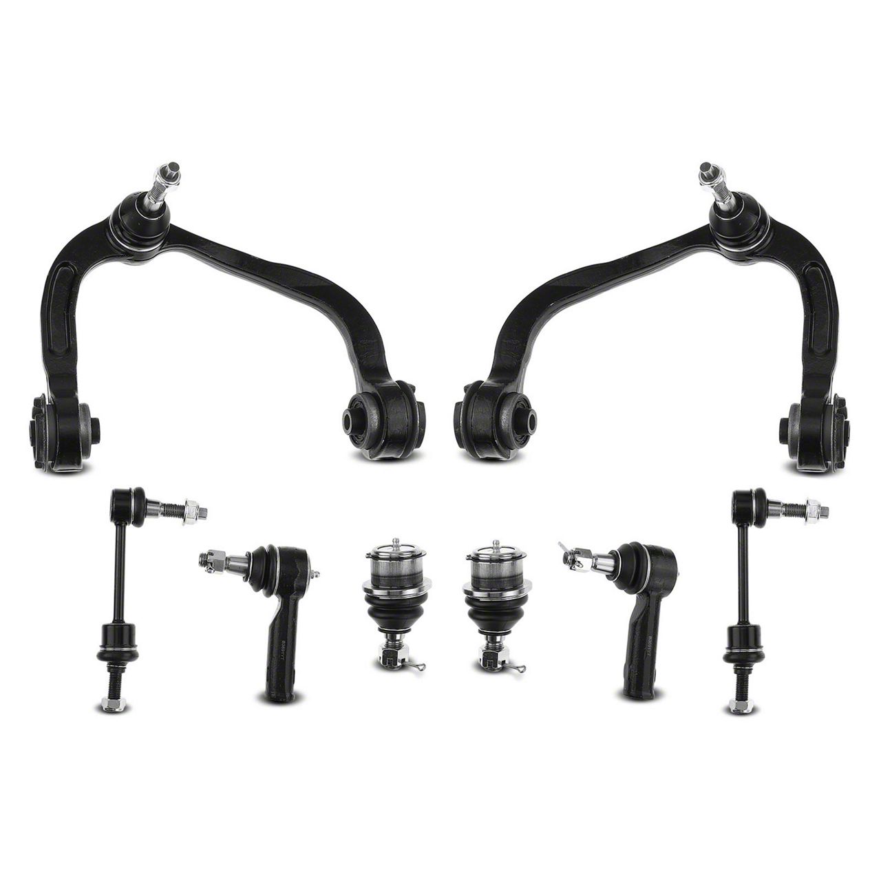 Complete Suspension Solution. The Front Upper Control Arm, Ball Joint, Sway Bar Link, and Outer Tie Rod End Kit is designed to restore your vehicle's front suspension and steering components to optimal function. It provides all essential parts in one convenient set, ensuring precise fit and reliable performance. This kit is critical for maintaining vehicle stability, control, and safety during operation.