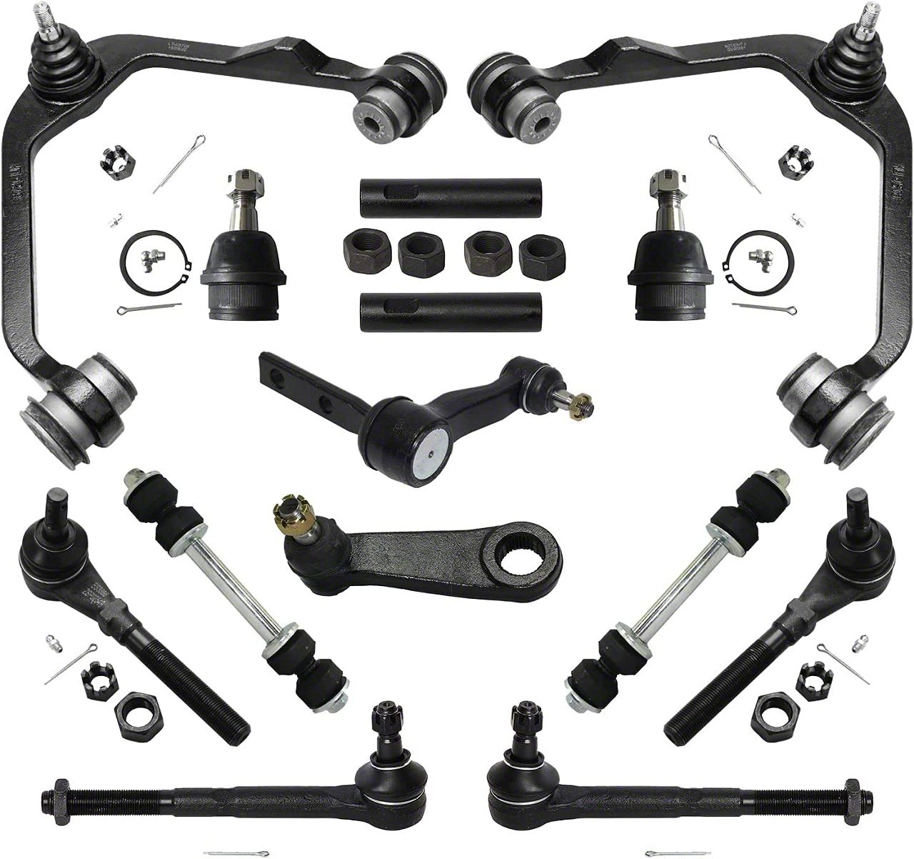 Comprehensive Suspension Upgrade. This Upper Control Arms Kit is a complete solution designed to restore and enhance the suspension performance of your Ford F-150. Including all critical components such as ball joints, idler arm, pitman arm, sway bar links, tie rods, and tie rod adjusting sleeves, it ensures smooth handling and reliable functionality for your vehicle.