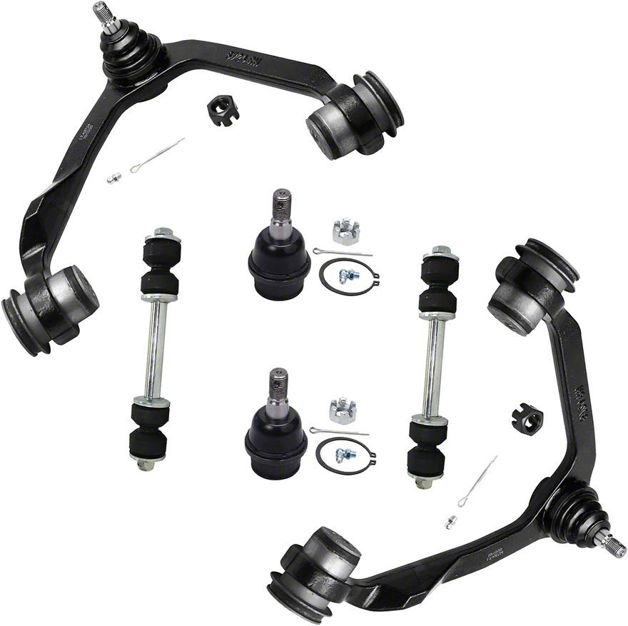 Construction and Appearance. Built to meet or exceed OEM specifications, each component in this kit has been impact, wear, and fatigue tested for maximum durability and long-term performance. The control arms are engineered for precise fitment and come pre-installed with high-quality ball joints, while the included sway bar links restore stability and reduce body roll. These components are manufactured using robust materials that withstand demanding road and off-road conditions.