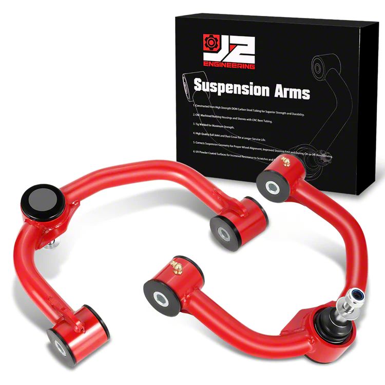 Construction and Appearance. Constructed for durability, these control arms are built to withstand the rigors of off-road use. The red powder-coat finish not only adds a layer of protection against corrosion but also gives your truck a distinctive, rugged look.