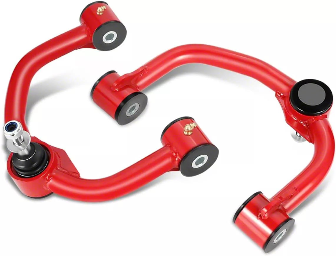 Construction and Appearance. These arms feature tubular and cast steel construction for exceptional durability under load. Finished in a bold red and black color scheme, they come equipped with greaseable upgraded ball joints that offer up to 80° of articulation and SpecRide bushings for quiet, controlled movement. Built-in caster correction and tire clearance improvements make them ideal for aggressive lift kits.