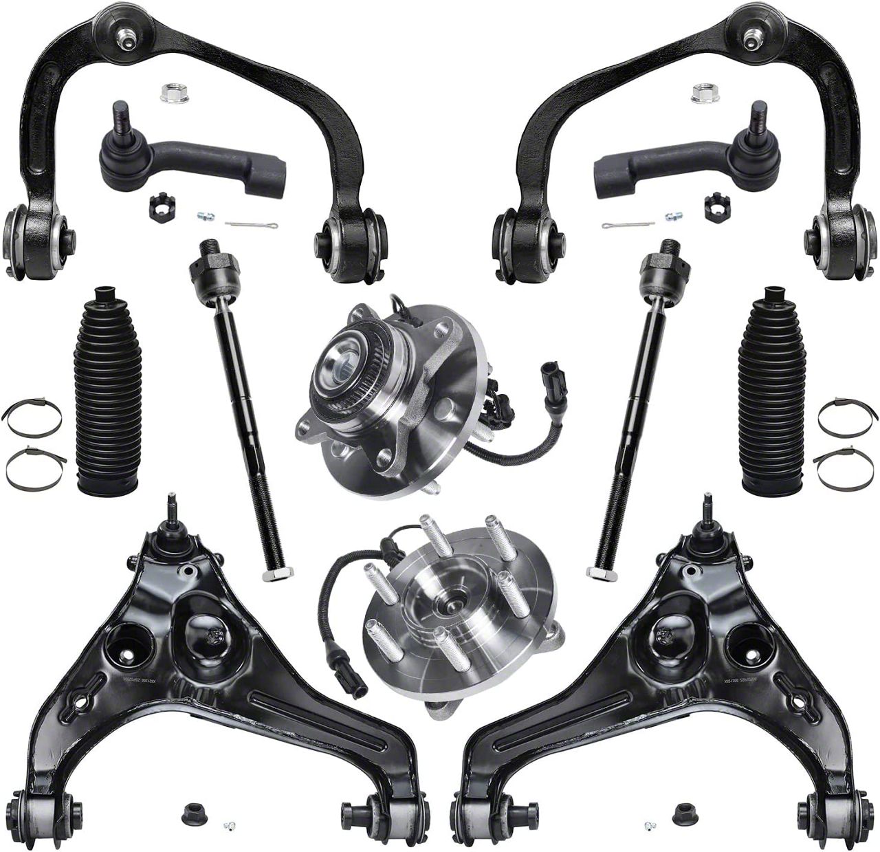 Built for Durability and Precision. Made from high-quality materials, these control arms, tie rods, and wheel hubs are built to handle the demands of heavy-duty use. Precision-engineered for optimal performance, this kit ensures long-lasting durability and smoother steering response, providing the stability and control needed for your vehicle's suspension system.