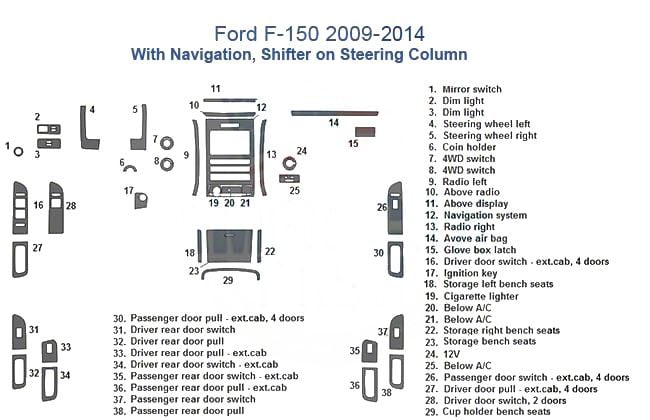Application. This Full Dash Trim Kit (Brushed Aluminum Finish) fits all 2009-2014 Ford F-150 models with Navigation and Steering Column Shifter.