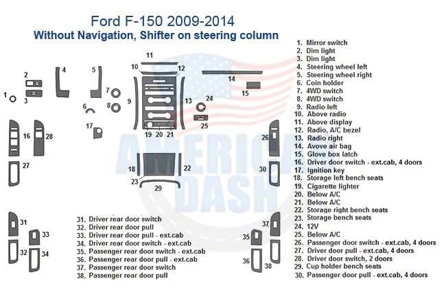 Application. The Full Dash Trim Kit fits 2009-2014 F-150 models with Steering Column Shifter & without Navigation.