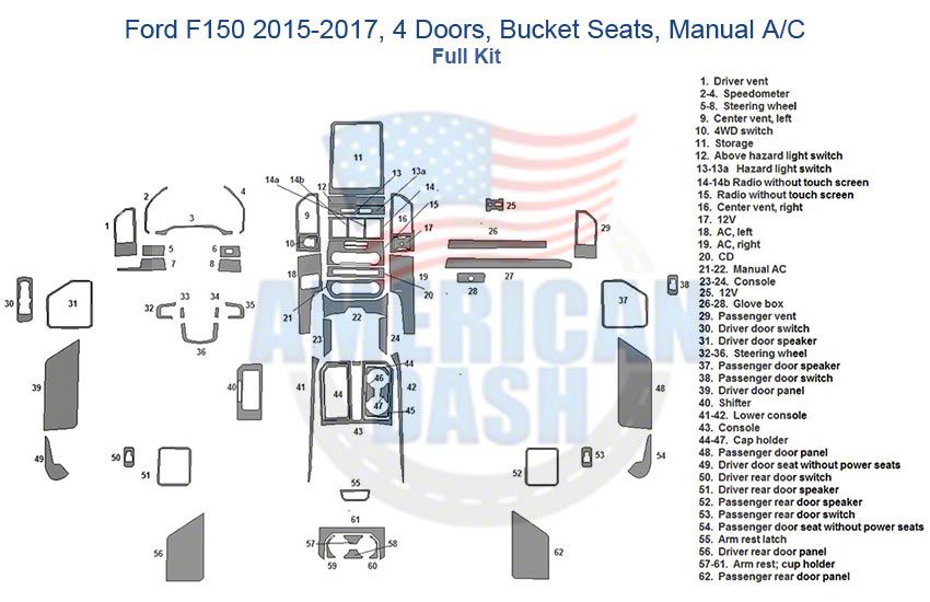 Application. This Full Dash Trim Kit fits 2015 – 2017 Ford F-150 SuperCrew models with bucket seats and manual A/C.